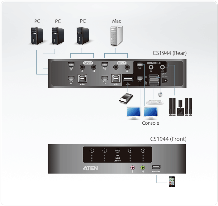 - قابلیت مستقل سوئیچ کردن بین: USB peripherals، صدا و کنسول کنترل (KVM focus)