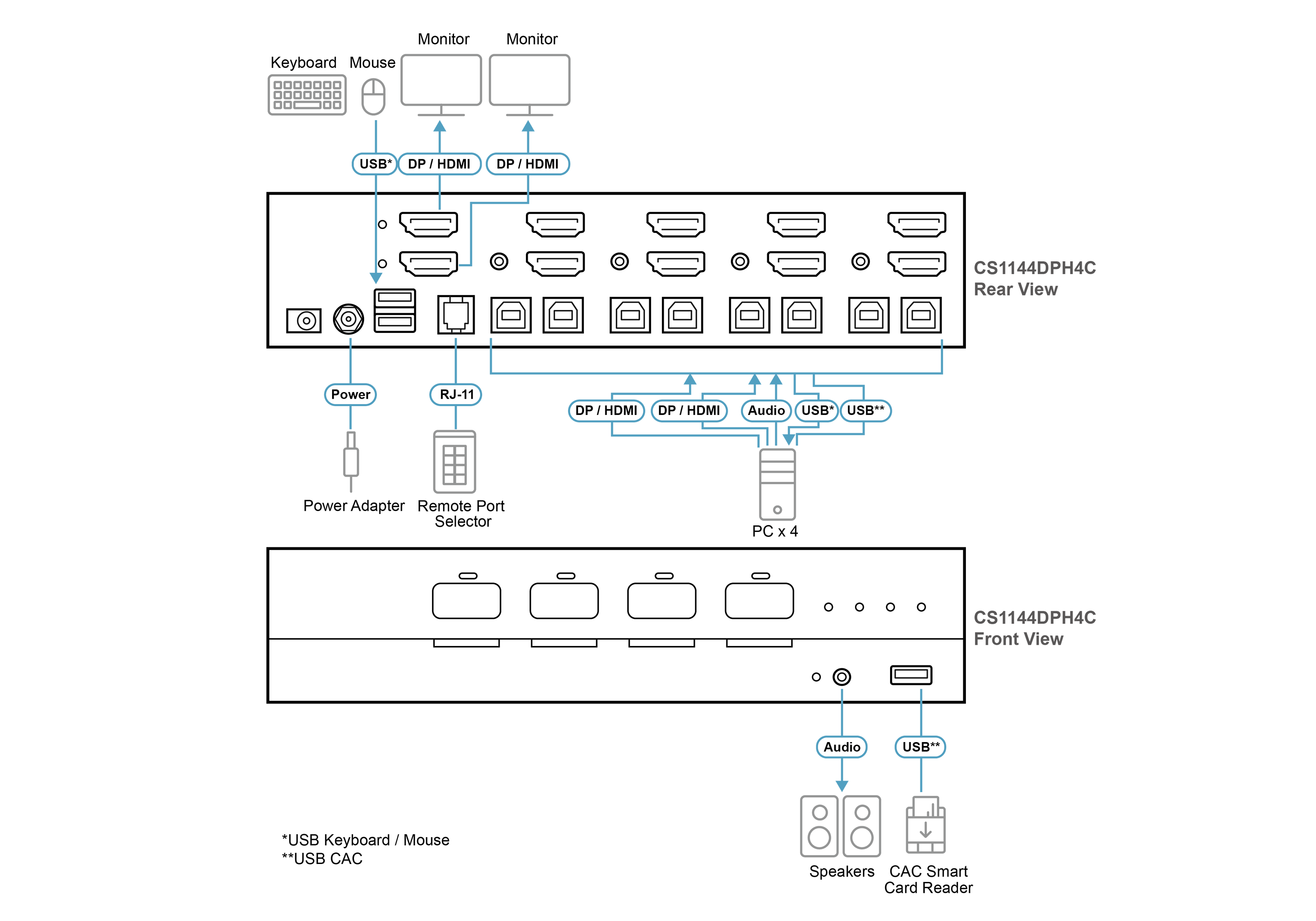 قابلیت انتخاب پورتها از طریق دکمههای فیزیکی (Pushbuttons) یا کنترل از راه دور (Remote Port Selector) برای افزایش امنیت و سهولت در استفاده.