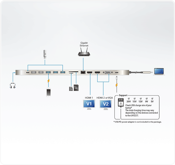 - تا 85 وات برای شارژ لپتاپ از طریق USB-C PD adapter