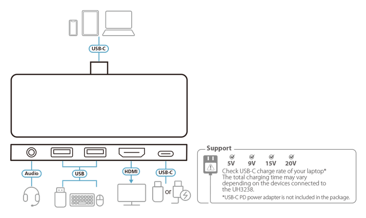 - UH3238 از ATEN یک travel dock (یا دانک همراه) است که برای کسانی طراحی شده که زیاد با لپتاپ، تبلت یا موبایل USB-C سفر میکنند و نیاز به گسترش پورت دارند. این دانک اتصالها و توان مورد نیاز را به شکلی جمعوجور و قابل حمل فراهم میکند