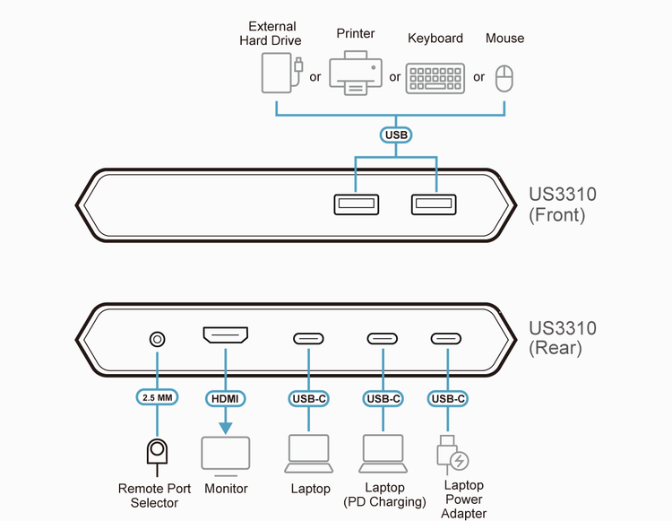 - مدل کامل: ATEN US3310 – 2-Port 4K HDMI USB-C KVM Dock Switch with Power Pass-through