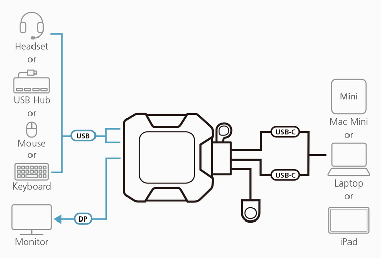- دو دستگاه USB-C مثل لپتاپ، تبلت یا مکبوک رو با یک صفحه کلید، ماوس و مانیتور DisplayPort کنترل بکنی و به راحتی بینشون جابهجا بشی.