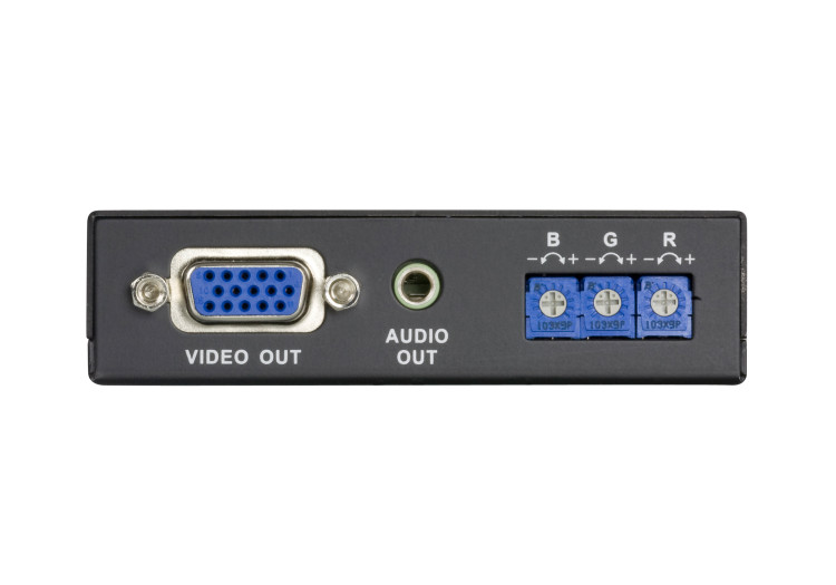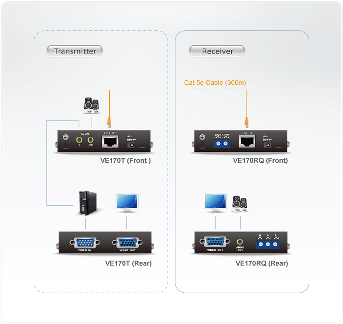 - یک دستگاه گیرنده (Receiver) در سری VE170 برای انتقال سیگنالهای ویدئویی و صوتی (Mono) از طریق کابل Cat 5e تا فواصل بسیار طولانی است