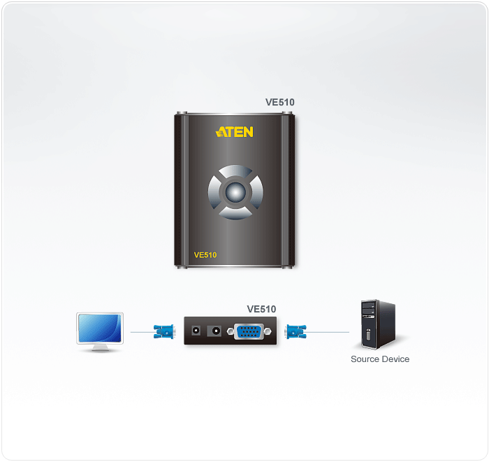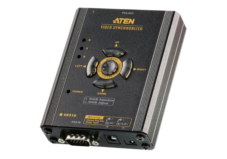 - ATEN VE510، وظیفهاش هماهنگسازی سیگنالهای VGA در مسافتهای طولانی است. این دستگاه خطاهای فاز رنگ (RGB) و تاخیرات زمانی را اصلاح میکند تا تصویر نهایی واضح و بدون اعوجاج باشد.