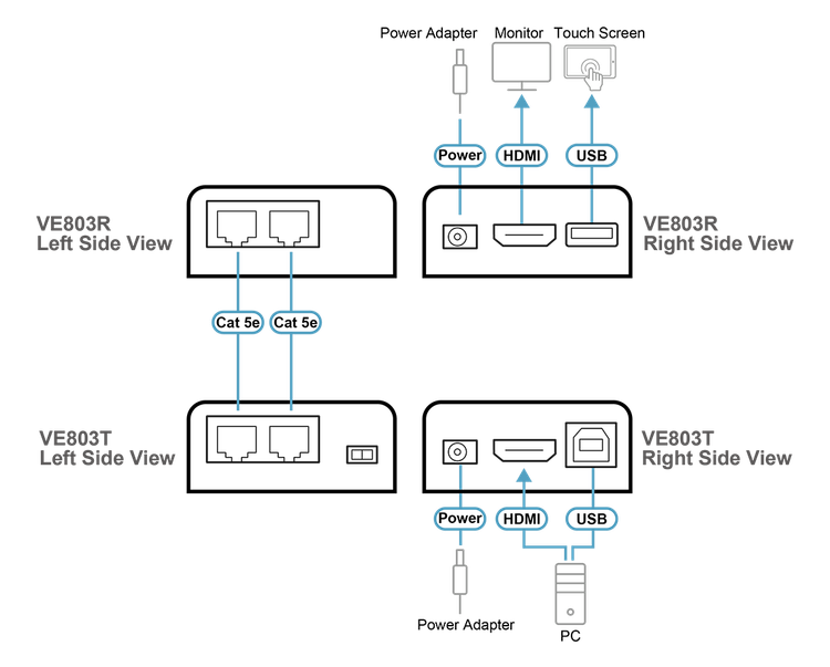 - VE803 یک افزایشدهنده HDMI و USB از برند ATEN است که با بهرهگیری از دو کابل Cat 5e امکان انتقال سیگنال HDMI تا فاصلههای قابلتوجه را فراهم میکند: